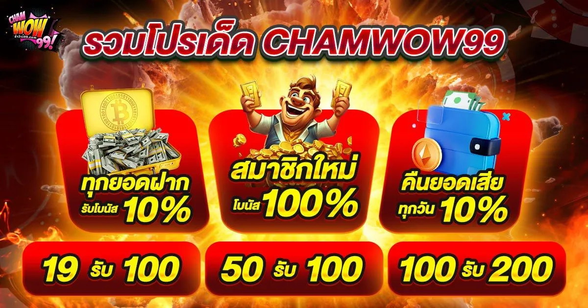 Chamwow99 จึงได้เตรียมโปรโมชั่นที่ตอบโจทย์ทุกสไตล์การเล่น ไม่ว่าจะเป็นสายปั่นสล็อต สายคาสิโนสด หรือคนที่ชอบแทงบอล ก็มีโปรรองรับครบถ้วน